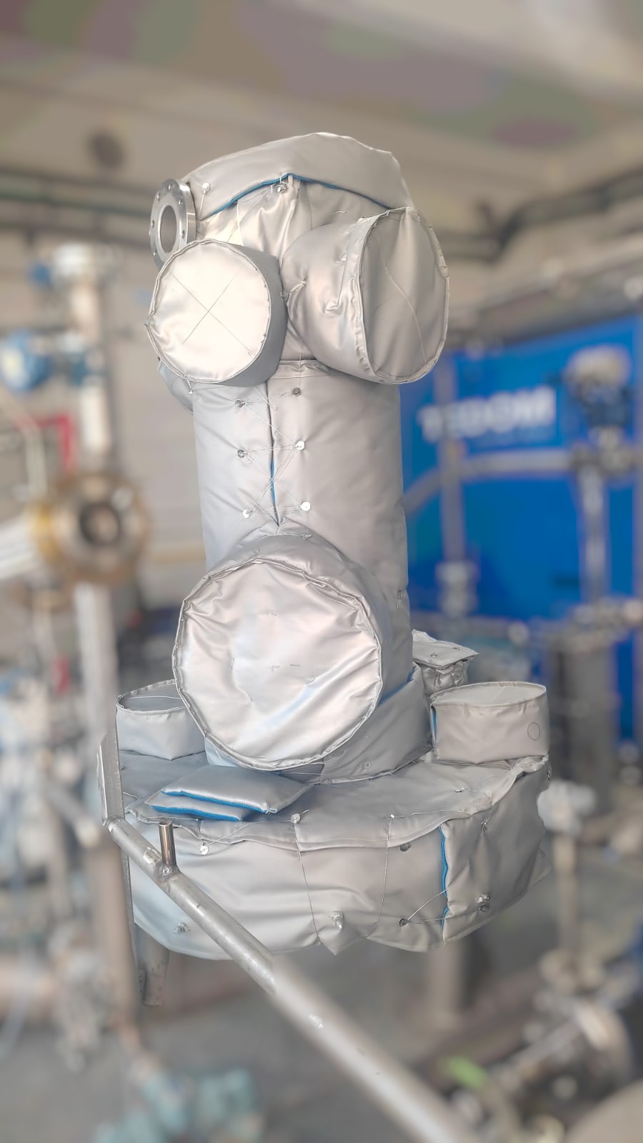 הפתרון: התקנת שמיכות בידוד התפורות במיוחד לפי מידות כך שהן מכסות לחלוטין את מחליף החום. השמיכות מכילות בידוד טרמי Ceramic Fiber 2" עשוי מסיבים קרמיים בעלי יכולת בידוד גבוה בנצילות של 30-50% ייעול.